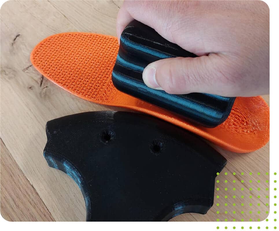 Het aanpassen van geprinte zolen verschilt van de conventionele frees- of lavignezolen. Omdat deze zolen gemaakt zijn van thermoplastisch materiaal, kunnen ze eenvoudig aangepast worden door ze te verwarmen. Daarom hebben we speciale mallen ontwikkeld, zodat je ze zonder moeite kunt aanpassen. Gebruik een föhn samen met onze mallen om de hoogtes te veranderen.