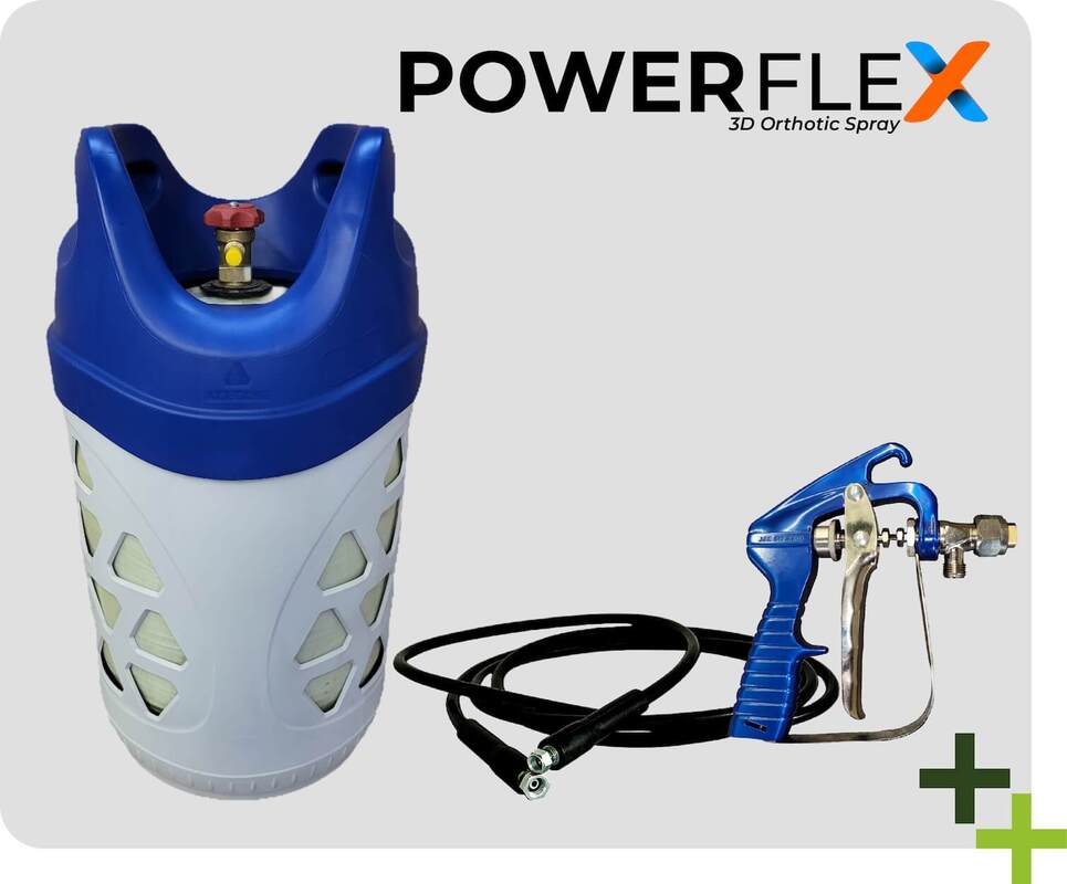 To begin using POWERFLEX 3D Orthotic Spray for orthopedic and podiatric applications, a one-time purchase of a spray gun and hose is required. This equipment is essential for applying contact adhesive evenly and efficiently to materials. The use of a spray gun and hose ensures precise and controlled application of the adhesive.
